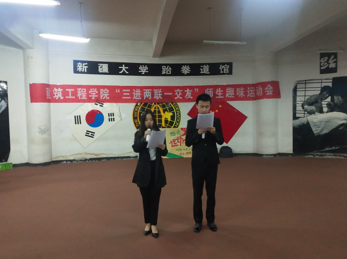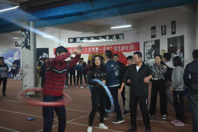 活动开始,主持人介绍此次趣味运动会的主题——“三进两联一交友”,然后贾力坤·曼苏尔老师发表讲话,提出对活动的要求以及对活动顺利举行的祝愿。在主持人宣布运动会项目之后,比赛正式开始。本次比赛的项目有:1.渡人过河2.托球跑3.心心相印4.呼啦圈竞走5.疯狂摇摆6.结对而行7.抢收抢种8.跳绳大接力。