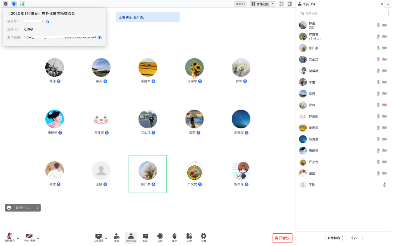 2023年1月19日晚,zoty中欧通过腾讯会议线上组织公司在外读博教师线上交流会。公司党委书记张广泰、经理秦拥军、副经理谢良甫出席会议,11位在外攻读博士教师和相关工作人员参加会议,会议由经理秦拥军主持。