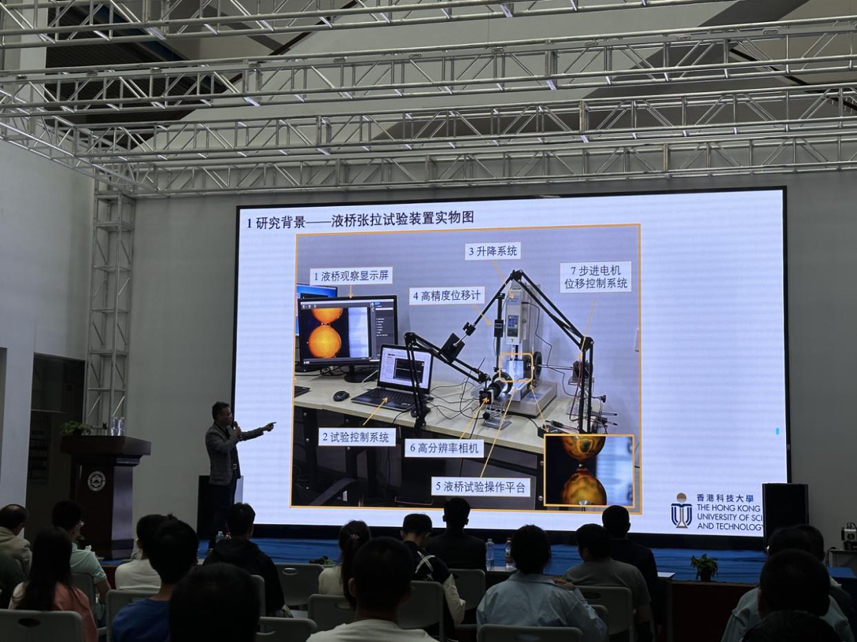 汇报中,陆钊博士介绍了自主研发的液桥张拉试验试验系统及开展试验情况,并采用了一种相场法耦合数值计算模型成功地模拟了物理试验现象。具体地,通过采用层流两相流模型和相场接触面模型耦合的数值模拟方法,在传统Navier-Stokes方程中加入了表面张力项,有效地模拟了液桥张拉物理过程中的固液气多相耦合作用。陆钊博士提出了一种更新的耦合数值计算模型,可以有效模拟液桥张拉物理现象,包括液桥破坏断裂过程。研究中发现,液体黏度对于液桥张拉过程有重要影响,采用黏度不同的液体开展研究,液桥断裂长度和形态有显著区别,液桥维持长度差异可达2~3倍。