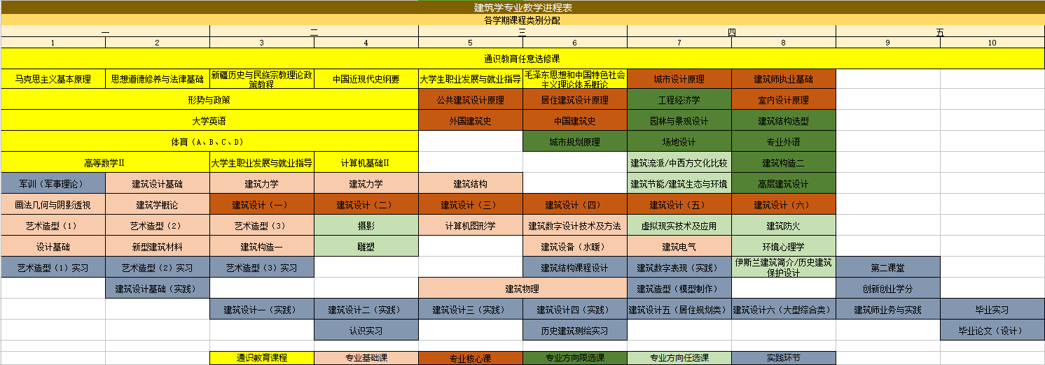 包括各年级建筑设计课程、建筑设计实践、建筑结构课程和毕业设计,其中后三者为实践环节。
