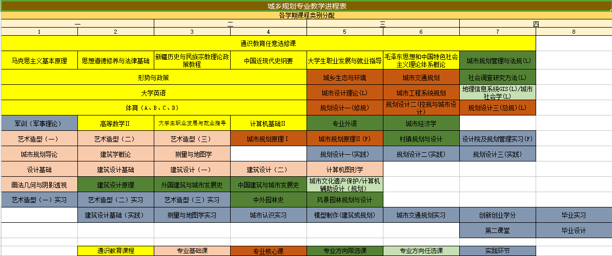 设计基础,建筑设计基础,艺术造型(一)、(二)、(三),画法几何与阴影透视,计算机图形学,中国建筑与城市发展史,外国建筑与城市发展史,中外园林史,风景园林规划与设计,建筑设计原理,建筑设计(一)、(二),城市规划原理I/Ⅱ,城市设计理论,村镇规划与设计,城乡生态与环境,城市交通规划,城市工程系统规划,城市经济学,规划设计一、二、三。