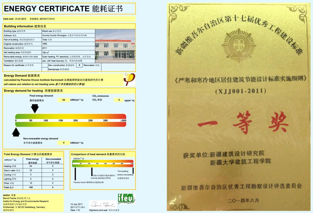 获得自治区优秀工程一等奖、德国能源研究所所授的《能耗证书》