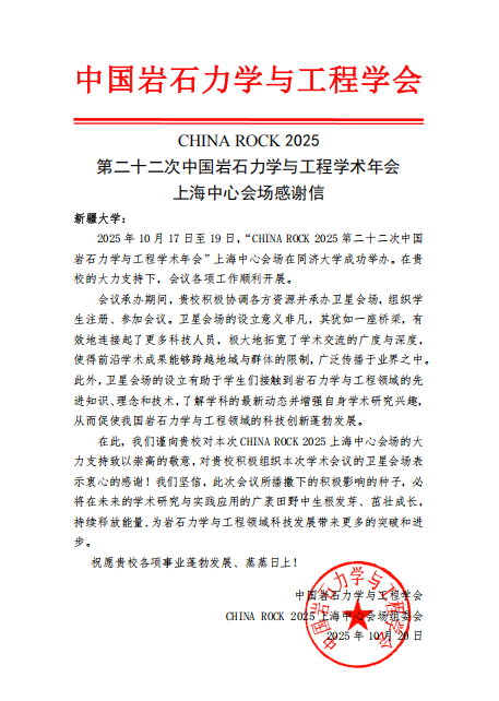 会后,China Rock 2025学术年会上海中心会场组委会向公司致感谢信。
