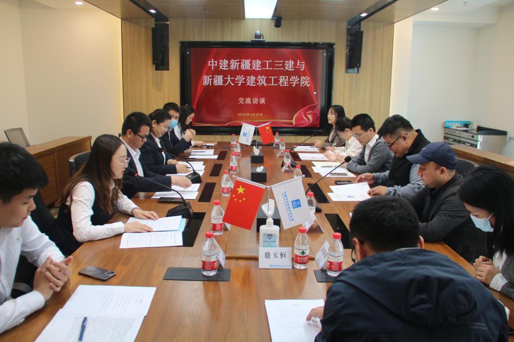 2022年4月22日上午,应中建新疆建工集团第三建设工程有限公司邀请,公司党委副书记贾力坤·曼苏尔,公司副经理谢良甫带领土木工程系青年教师马莉,阿力普江·杰如拉,田盼盼,汪珍萍,辅导员骆玉恒一行前往中建新疆建工集团第三建设工程有限公司,与中建新疆建工集团第三建设工程有限公司副总经理、总工程师车海宝,助理经理刘媛,物资采购部负责人李定禄,人力资源部负责人王茹,科技质量部费双,物资采购部陈建国进行交流访谈。